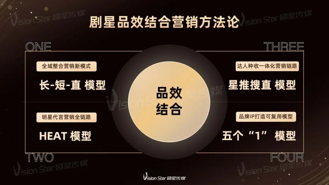 其中,“长 短 直”全域整合营销模型,通过长视频内容塑品牌心智、短内容破流量瓶颈、短代言强用户记忆、直播促进即时转化,打通“种草-引流-转化”全链路闭环,最大化内容IP的价值;HEAT营销模型涵盖热点捕捉、热点绑定、星粉互动到销售转化的完整链条,以明星热点赋能全域营销;星-推-搜-直营销模型,以达人影响力驱动增长;而“五个1”模型则通过1个IP主张、1组主推爆品、1项燃点内容、1段全民事件、1波增速硬广,为品牌IP构建可复用的增长模型。